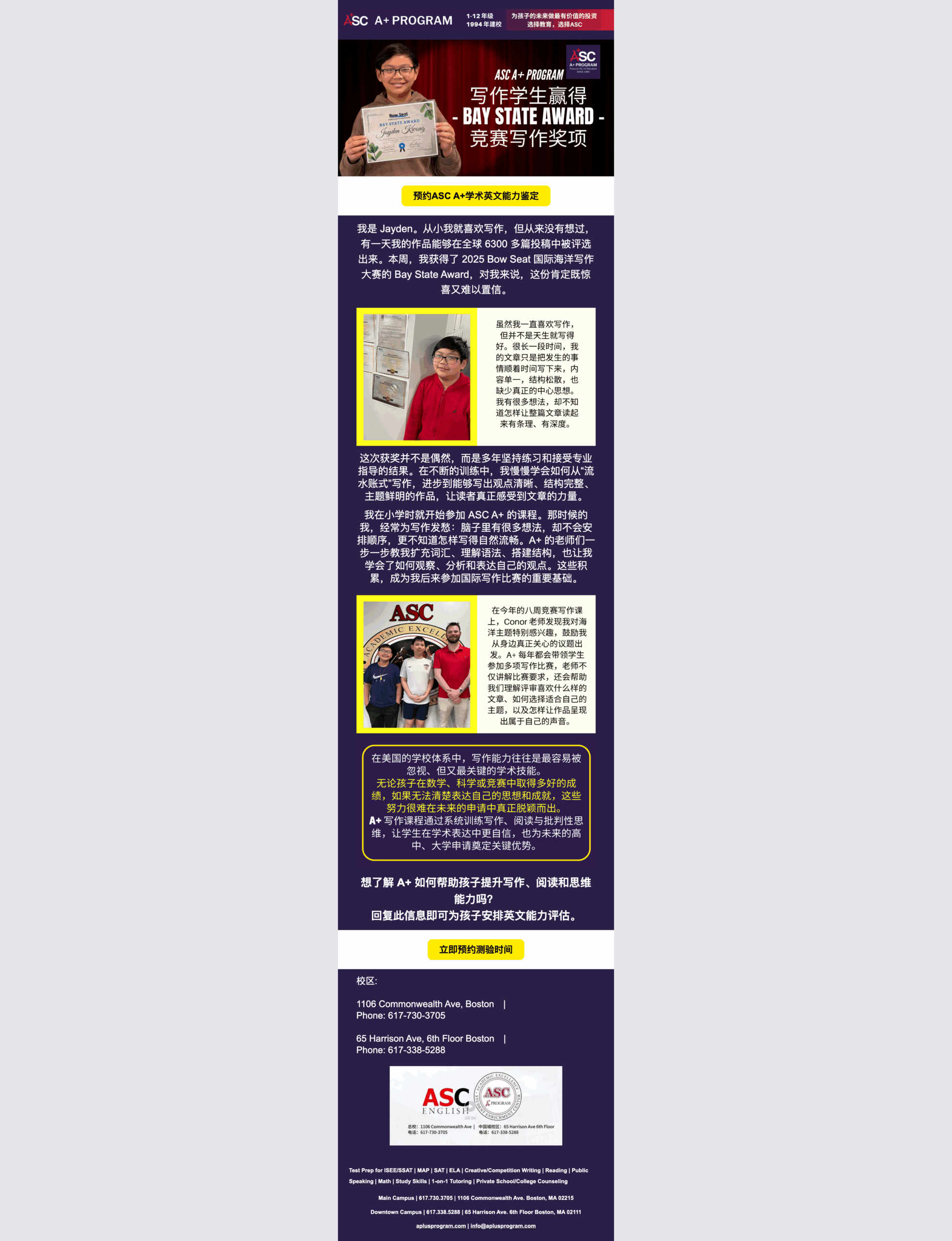 A+学生Jayden荣获 Bay State Award,他是如何从 6300+ 投稿中脱颖而出的?