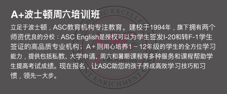 A+精英班是一个绝妙的经历。它帮助我们的女儿能在学校有突出表现。我们第一次来ASC的时候是因为女儿在学校数学落后了。A+帮助我们女儿赶上了年级进度并且超越常人。她现在考上了BB&N。没有ASC的帮助,我们的女儿就不会有今天的成就。感谢诚挚的员工和老师,谢谢你们。--Anaka